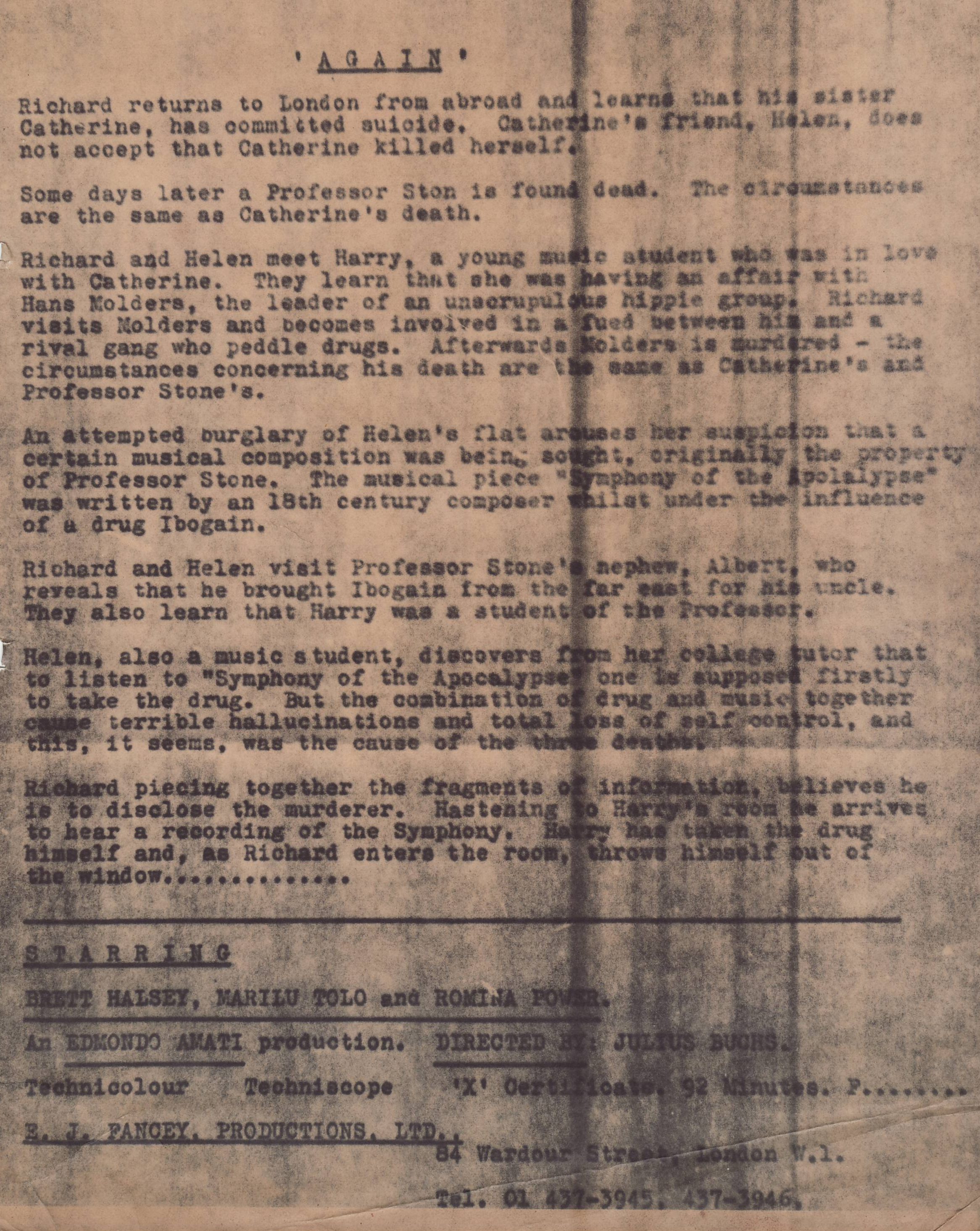 E. J. Fancey re-named the film Again, a fairly meaningless choice unless E.J. Fancey were referring to the re-teaming of Brett Halsey and Marilu Tolo, who had been widely seen in Tulio Demicheli’s Espionage in Lisbon in UK cinemas during the spy film boom. This is just guesswork, though.